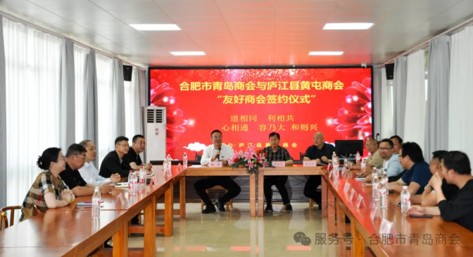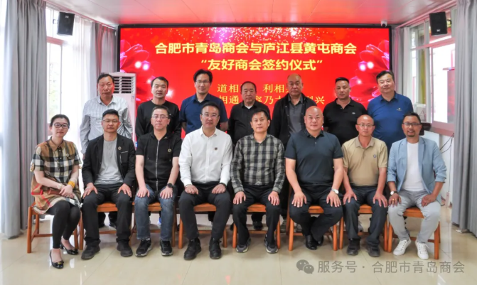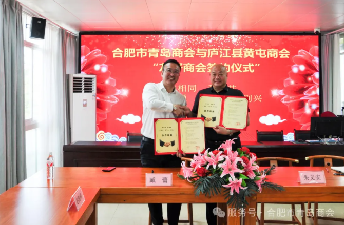 之后,大家来到庐江东郡温泉山庄二楼会议室举行座谈并进行“友好商会签约仪式”。朱义安会长首先介绍了黄屯商会的历史脉络、活动开展及未来发展等情况,李永科副主席则对庐江的历史及文旅资源进行了介绍。臧蕾会长表示,黄屯老街历史悠久,非遗资源与文旅游学融合发展,将推动传统文化的商业化转化;庐南川藏线资源独特,距合肥近,有区位优势,文旅潜力很大;照壁山生态百果园则在探索“绿水青山”向“金山银山”转化的乡村振兴新路径,双方商会可以发挥更多的平台资源和整合优势,助力地方经济更好更快的发展。随后双方商会就如何加强商会建设、提高商会间及会员企业间的交流合作等进行了探讨。最后,两位会长共同签署了“友好商会协议书”并合影留念。